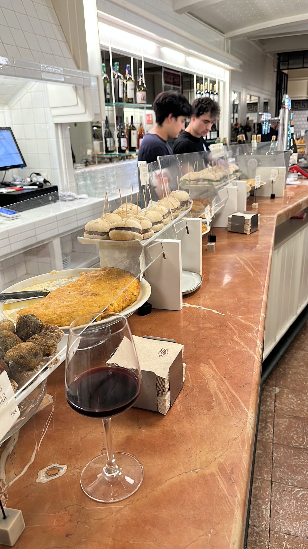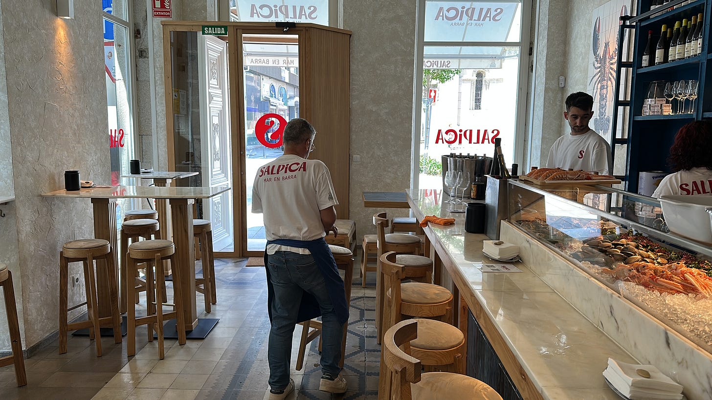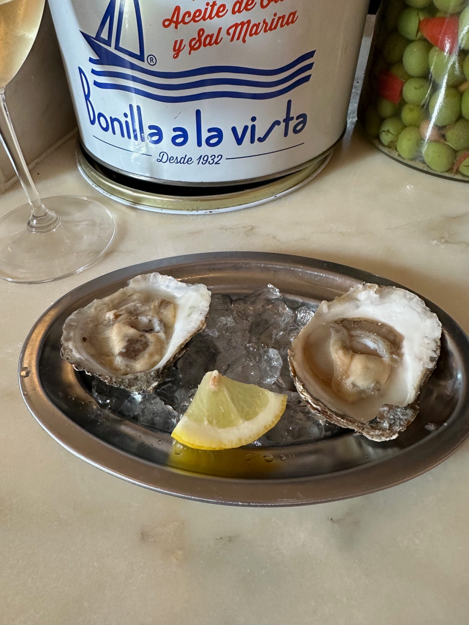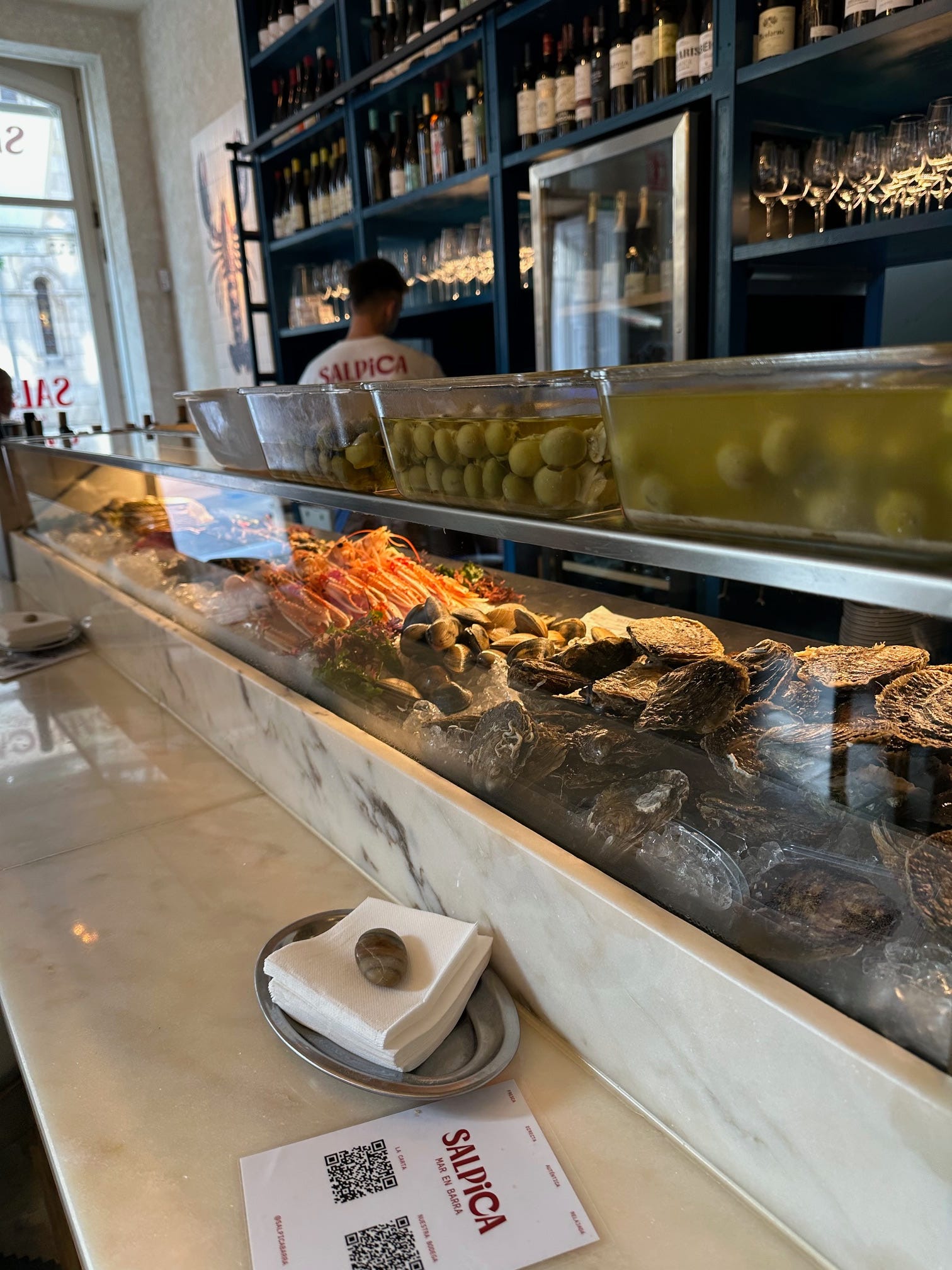 Shortly after arrival I found Salpica - Mar en Barra, a stunning seafood and wine bar located near the trendy calle Olmos where one can find a good selection of pinxtos bars. I was impressed with the service and also how clean the partially open kitchen was. On two separate visits I ordered the Galician oysters (two types - the planas or flat, and the large, more unctuous), the berberechos (steamed cockles) and a live cigala (langoustine) a la plancha served with nothing. Delectable.